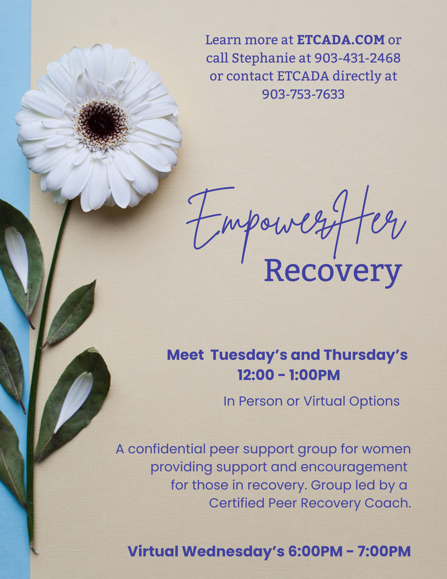 "EmpowerHer Recovery" meets every Tuesday and Thursday 12-1 pm at Longview ETCADA.